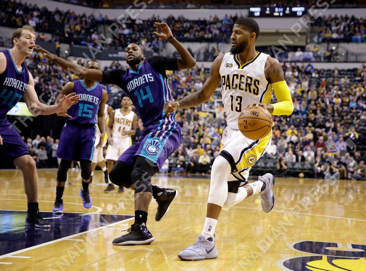 Indiana Pacers forward Paul George (13) drives on Charlotte Hornets forward Michael Kidd-Gilchrist (14) during the second half of an NBA basketball game in Indianapolis, Wednesday, March 15, 2017. The Pacers defeated the Hornets 98-77. (AP Photo/Michael Conroy)