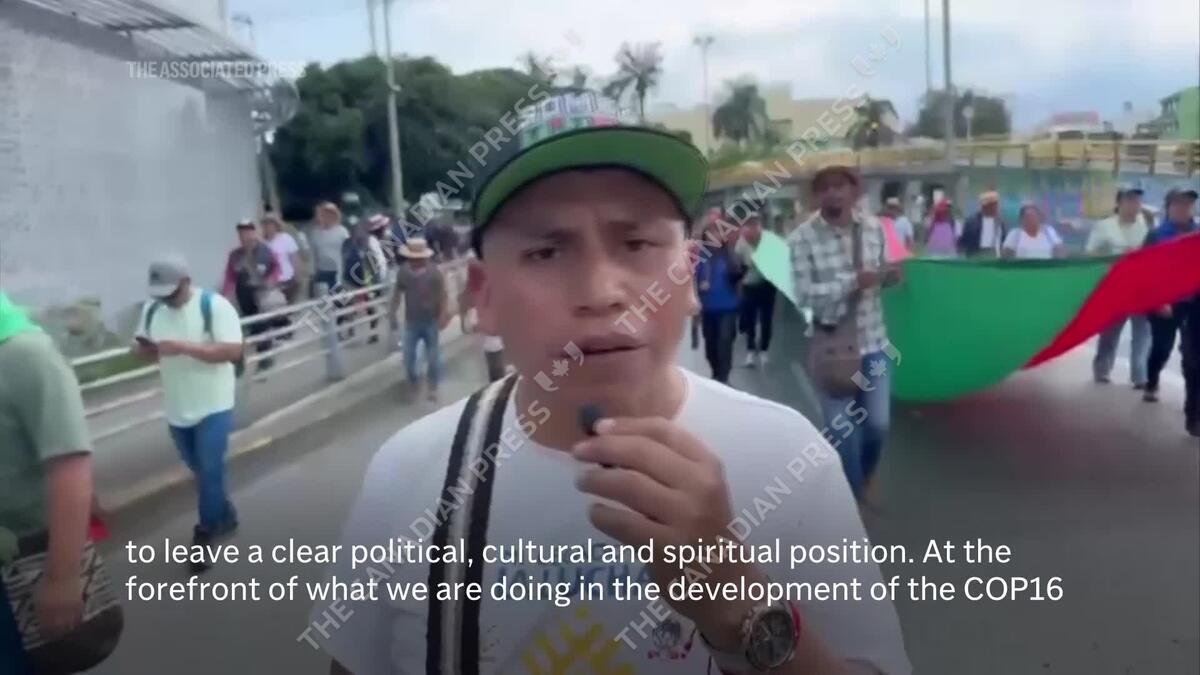 Indigenous people from southwest Colombia protest at COP16 in Cali