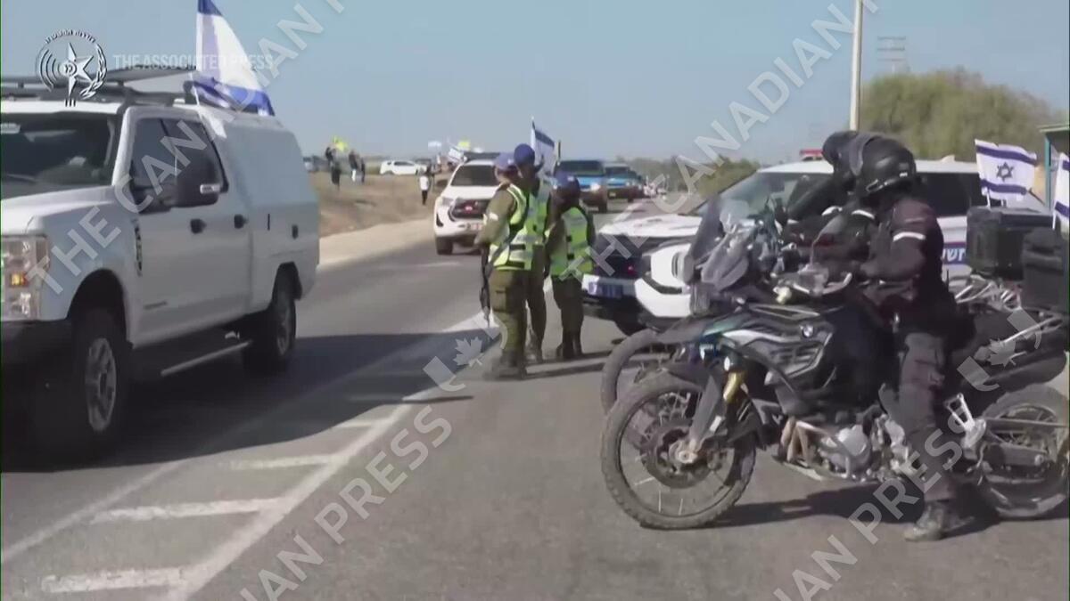 Convoy transports bodies of deceased hostages into southern Israel following release by Hamas