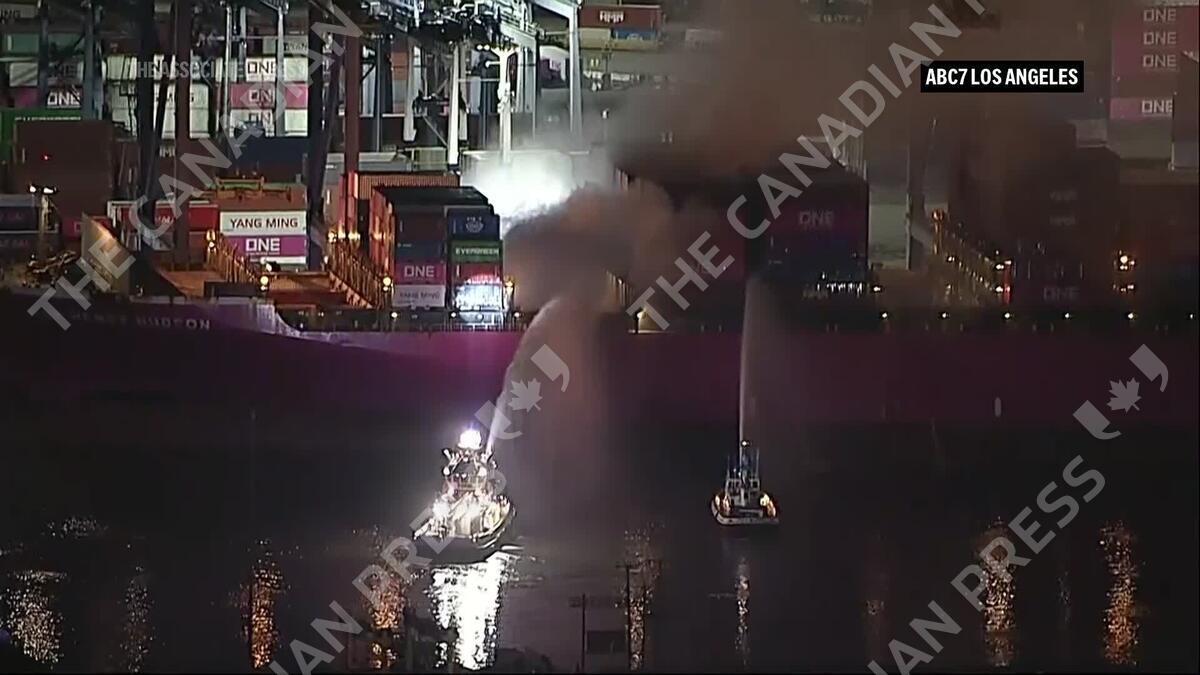 Dozens of firefighters battle blaze on container ship docked at LA port